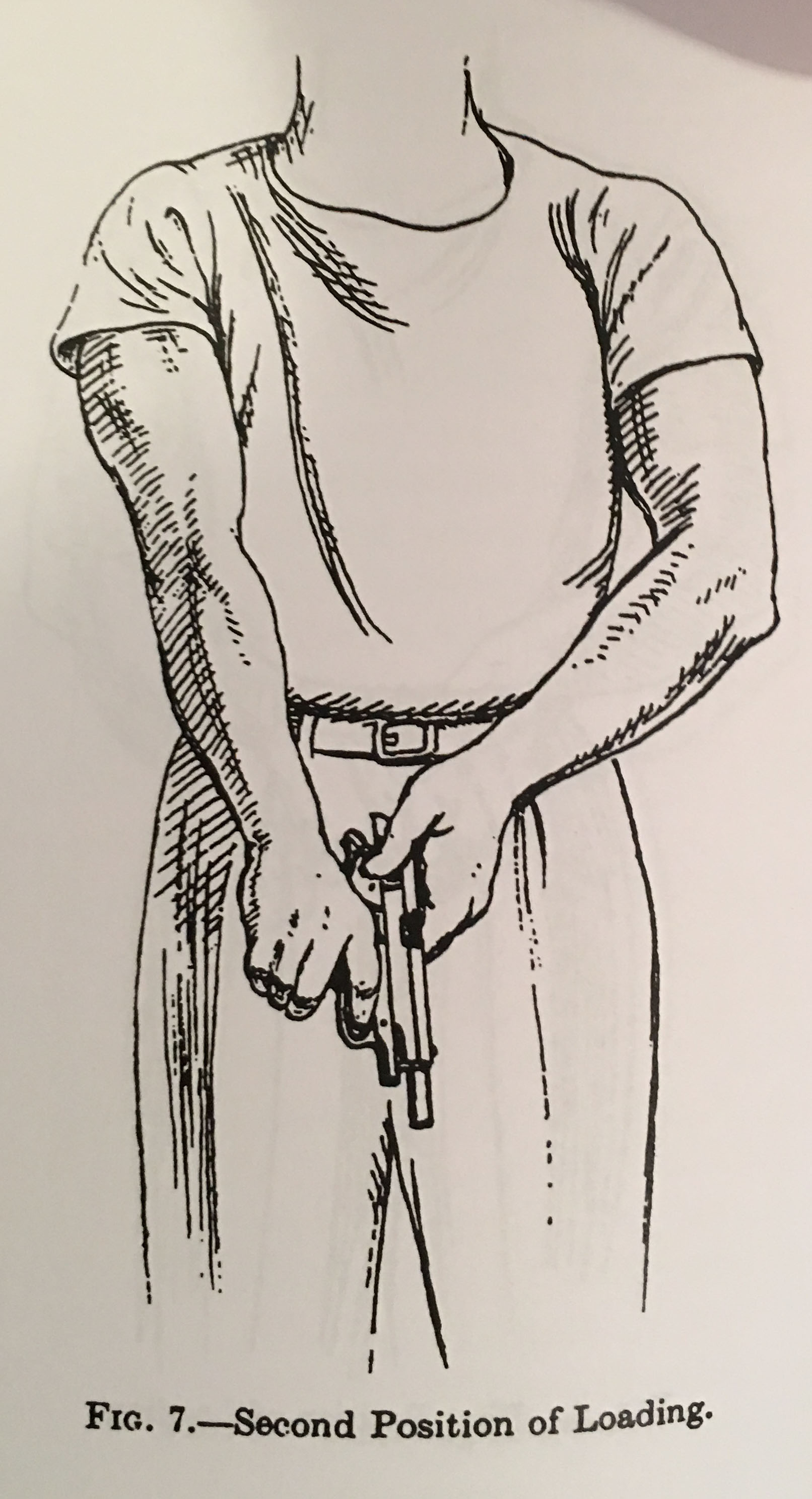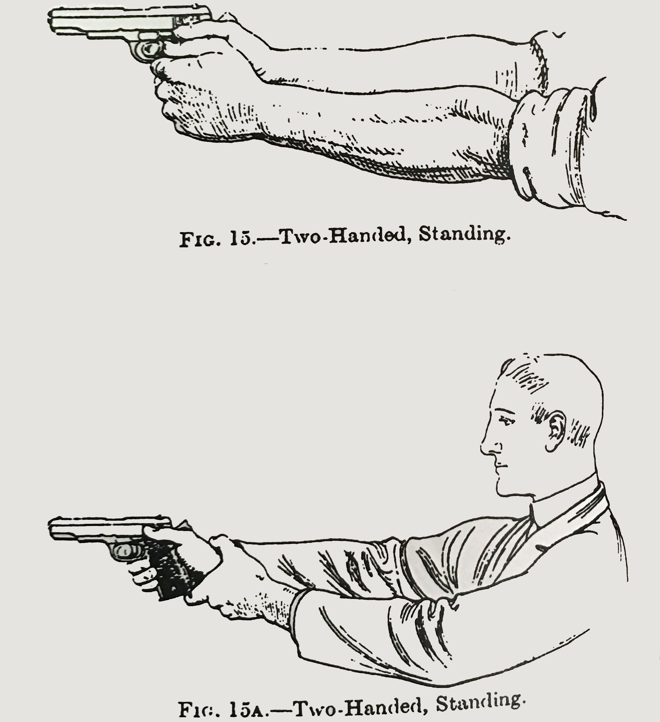 One of two handed positions they recommend looks like the modern thumbs forward grip, with thumbs lower on the frame than is currently taught, and the other is a precursor to a Weaver stance, with bent elbow, but with the support hand grabbing the dominant hand wrist, as opposed to gripping the pistol itself.