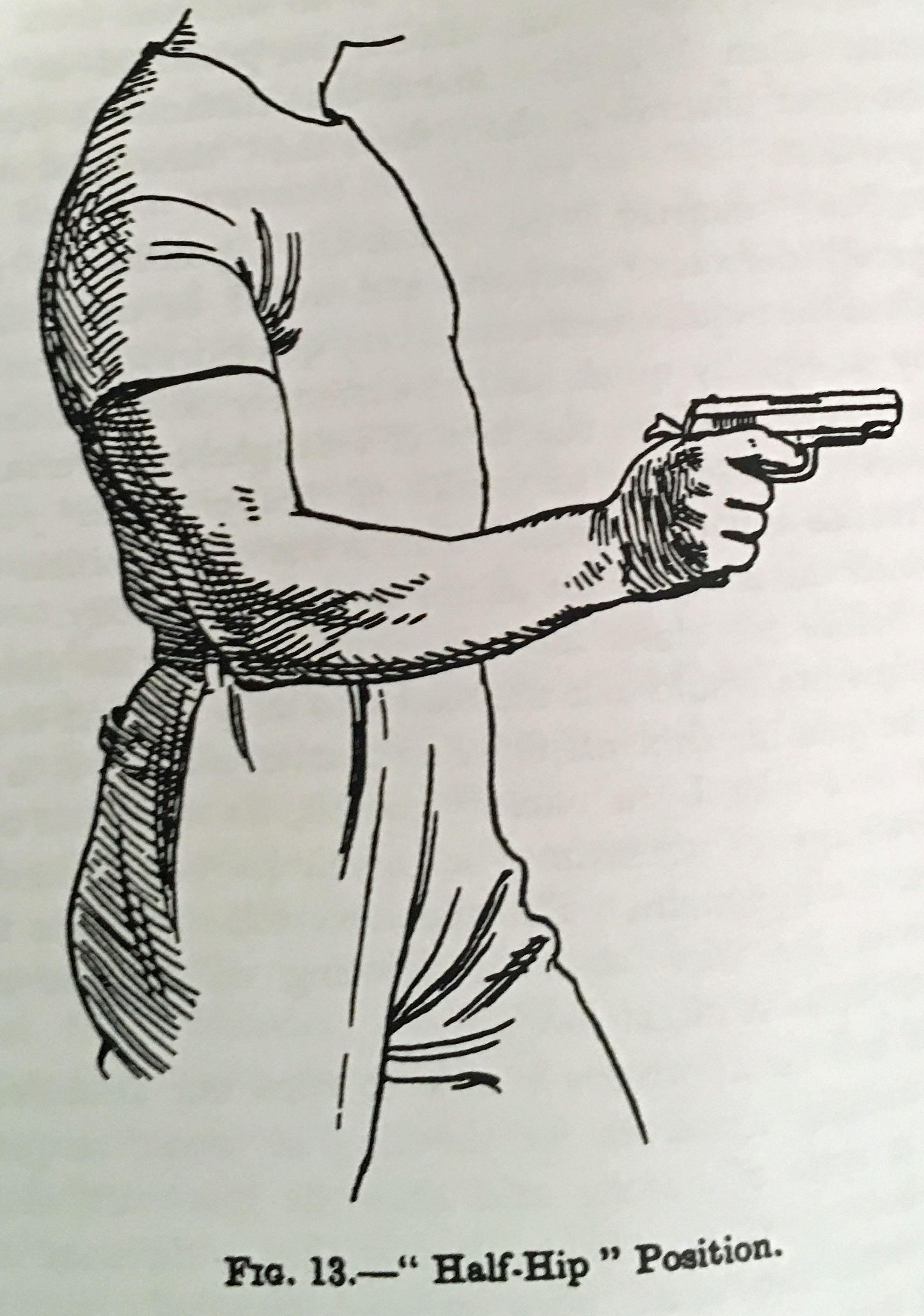 This video from Paul Gomez shows the modern manifestation of the idea of shooting from positions 2, 3 and 4 of the draw – same as Fairbairn/Sykes quarter hip (2) and half hip (3) positions, with Paul showing a 3/4 hip technique as “also shooting from the 4 position”.