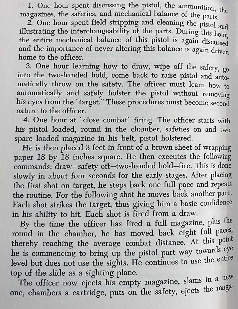 The rest of the training program includes slide lock reloads, firing pairs of shots, and shots fired at distances as far as 20 yards. Compared to the PPC, FBI and bullseye courses used by most departments, this program is considerably more realistic and relevant, even if it discourages sighted fire. (My suspicion is that many shooters of this era, particularly those that performed well, used the sights more than their instructors wanted them to.)