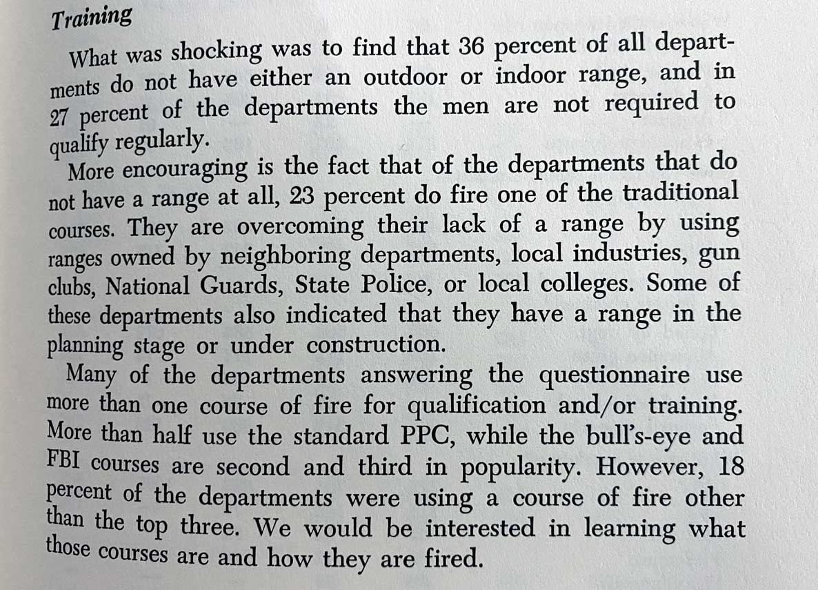 Bristow shares data from a “Law and Order” magazine survey of 352 police chiefs who provided data in sixteen different categories related to equipment and training. The date of the survey is not provided, but from the way this section is written, my assumption is it was late 1960’s or early 1970’s, near the time of book publication. The data was broken down into five brackets based on size of community served. .38 special 4″ revolvers were by far the most popular, with 80% or more (depending on bracket) carrying that gun. .357 magnum accounted for most of the remaining 20%, with .45 Colt, .45 ACP or other calibers lumped together into one “miscellaneous” category.