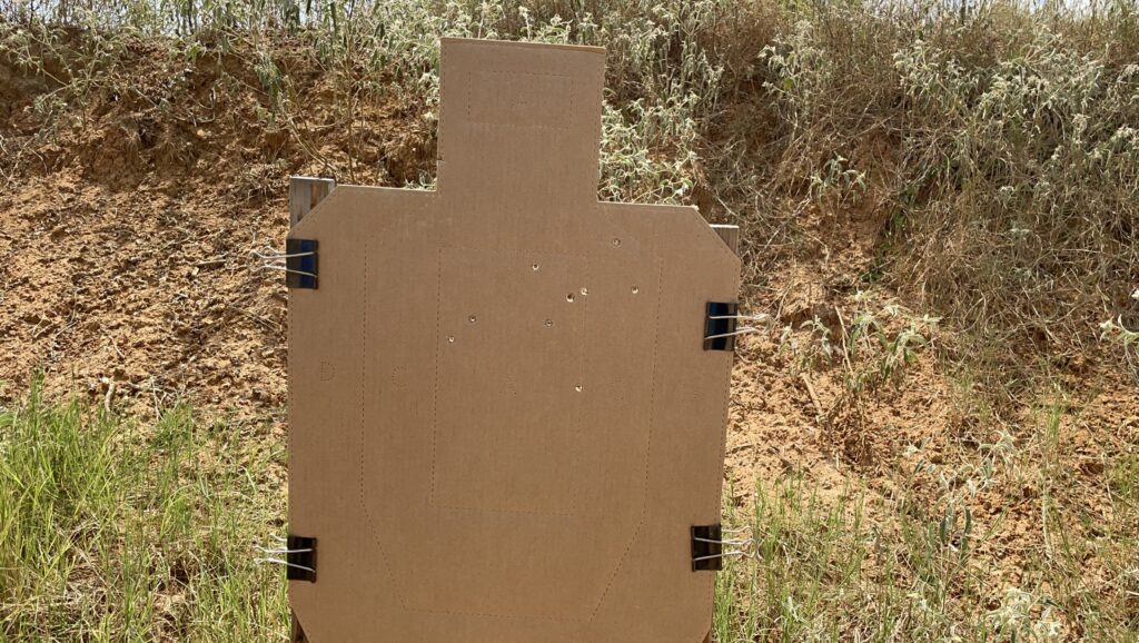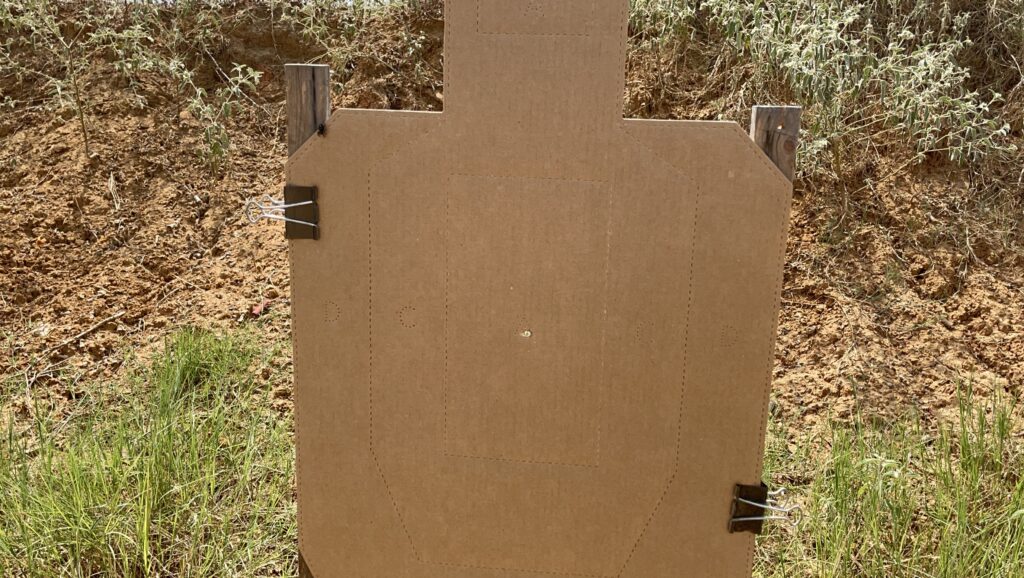 Target: Any humanoid target with a realistic size high value scoring area may be used (IPSC, IDPA etc.) Paper plates may be affixed to any target to create a realistic size, high value scoring area. Steel reactive targets may be used with frangible ammunition. Only hits in high value area count!