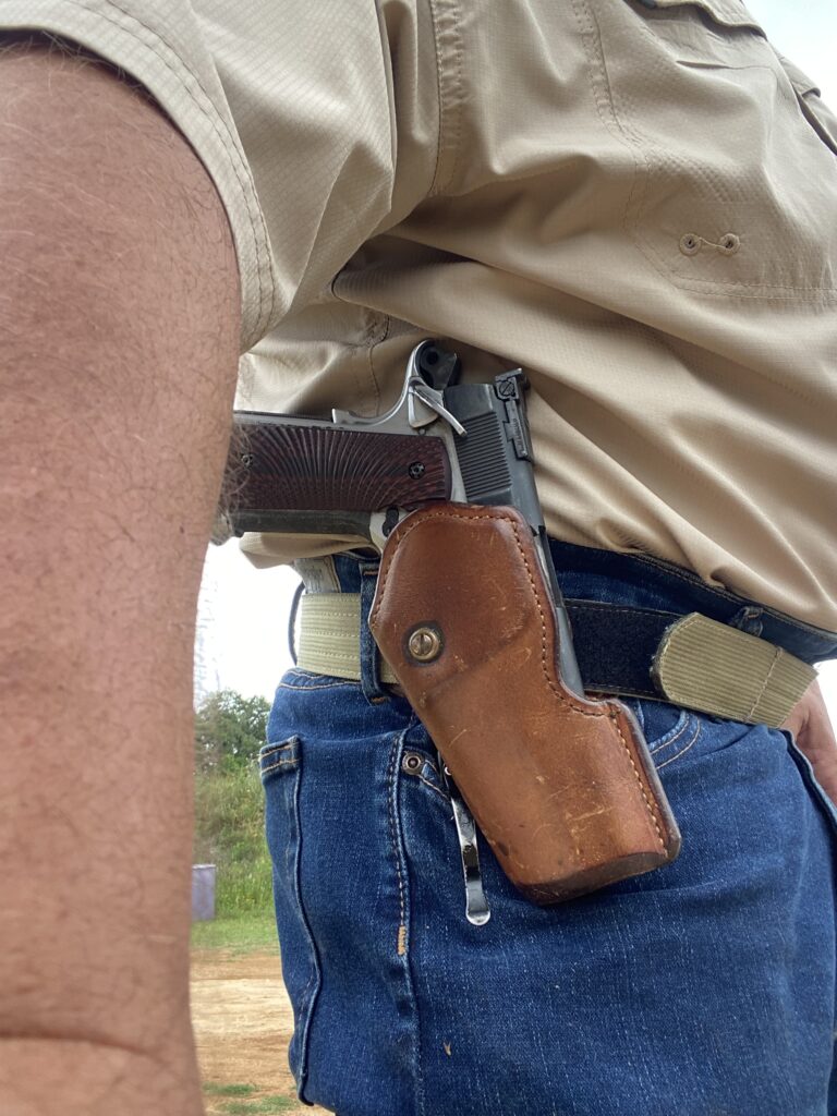 1980’s Gordon Davis outside the waistband, steel lined leather gamer speed holster.