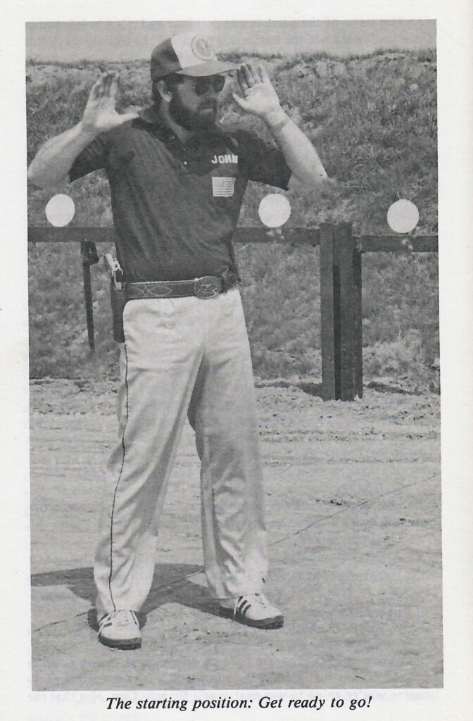 The classic Steel Challenge start position, wrists above shoulders. The popularity of the “surrender” start for competition, particularly in the 1980’s, became a topic that tacticians more concerned with defensive shooting criticized. I remember going to a police dept “fun shoot” in the early 1990’s, and they made a big deal about not using the surrender position to start any course of fire. These days outside of Steel Challenge stages, where it’s still the required start position, the surrender start is rarely used.