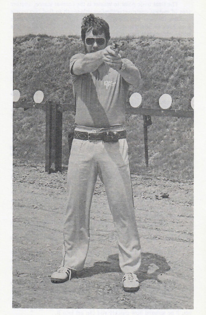 Shaw’s grip and stance, circa 1982, with support side elbow partially bent. Classic thumb over thumb grip is used. Modern “thumbs forward” grip didn’t become dominant until the late 1980’s when Rob Leatham and Brian Enos popularized it.
