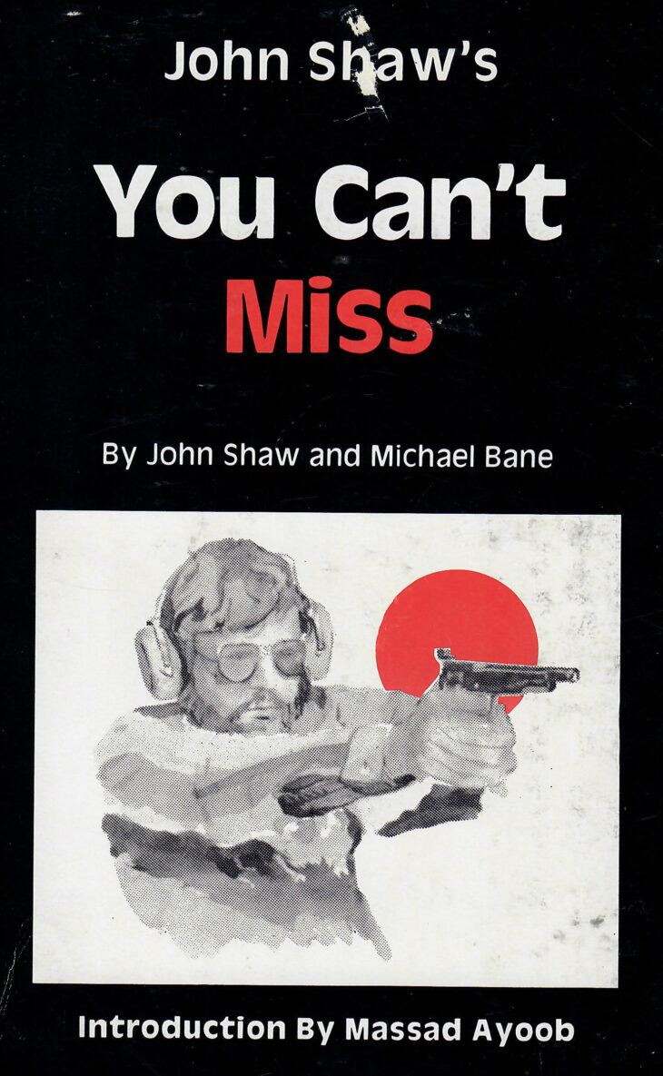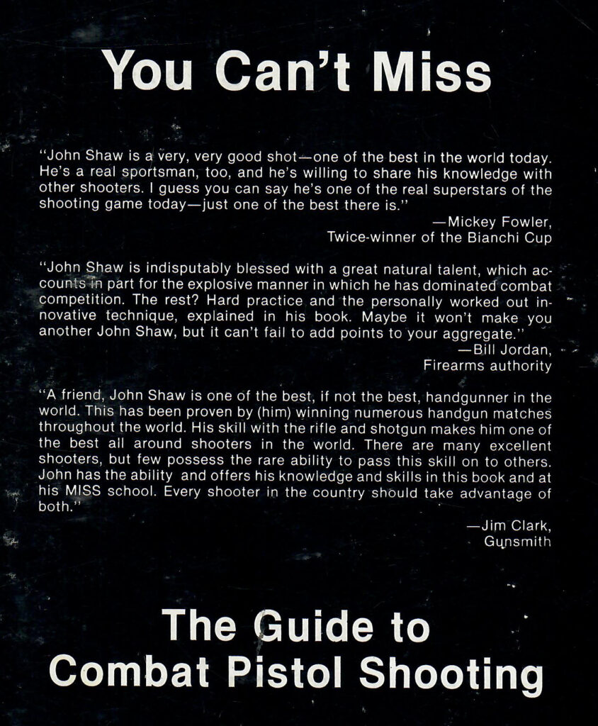 In 1982 Shaw and Michael Bane published the book “You Can’t Miss” (with introduction by Massad Ayoob). The book captured the best knowledge of what the top shooters in IPSC were doing. The Isoceles stance, 1911’s with barrel weights and compensators, steel lined holsters, and shooting B8 targets were all core ideas from which current shooting training and technique evolved.