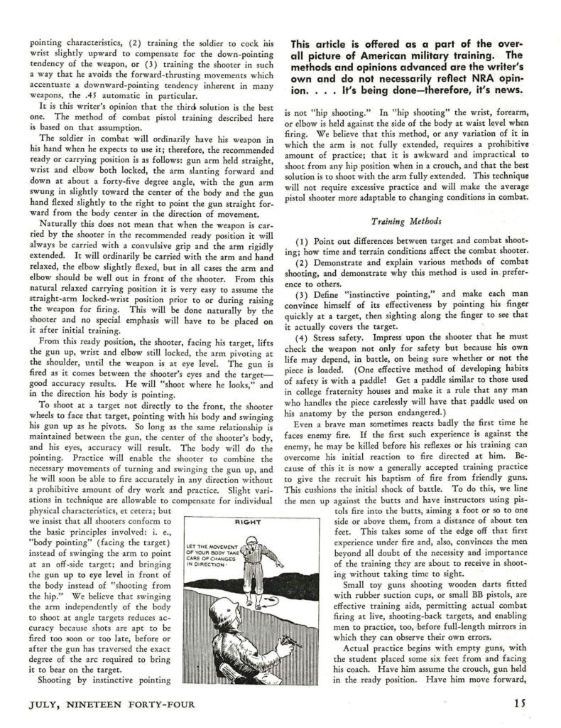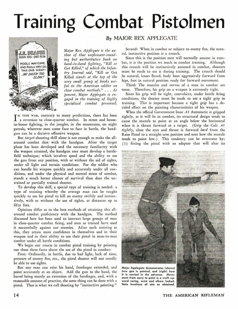 In 1944, Applegate summarized his pistol training program in the NRA’s American Rifleman magazine.