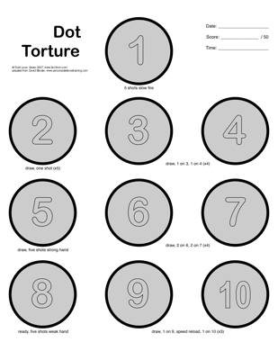 Dot Torture was developed by David Blinder. Like the NRA Basic Pistol test at the top of this test, it has no time limit and is purely a test of marksmanship. It uses small dots and requires two handed, and one handed shooting, reloads, drawing, and other skills.