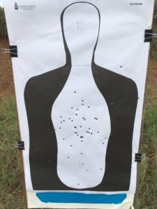 What this really means is “draw and shoot 5 in 3 seconds or less, reload in 18 seconds or less, shoot 5 more shots in 3 seconds or less.”  The hip shooting part was fun.  The target below was a 2.5 second run for “draw and hipshoot five shots at 7 yards”.   What I learned from running that drill was that you have to pay attention to where the first shot lands, so you can correct your “pointing” if needed before firing shots 2-5.
