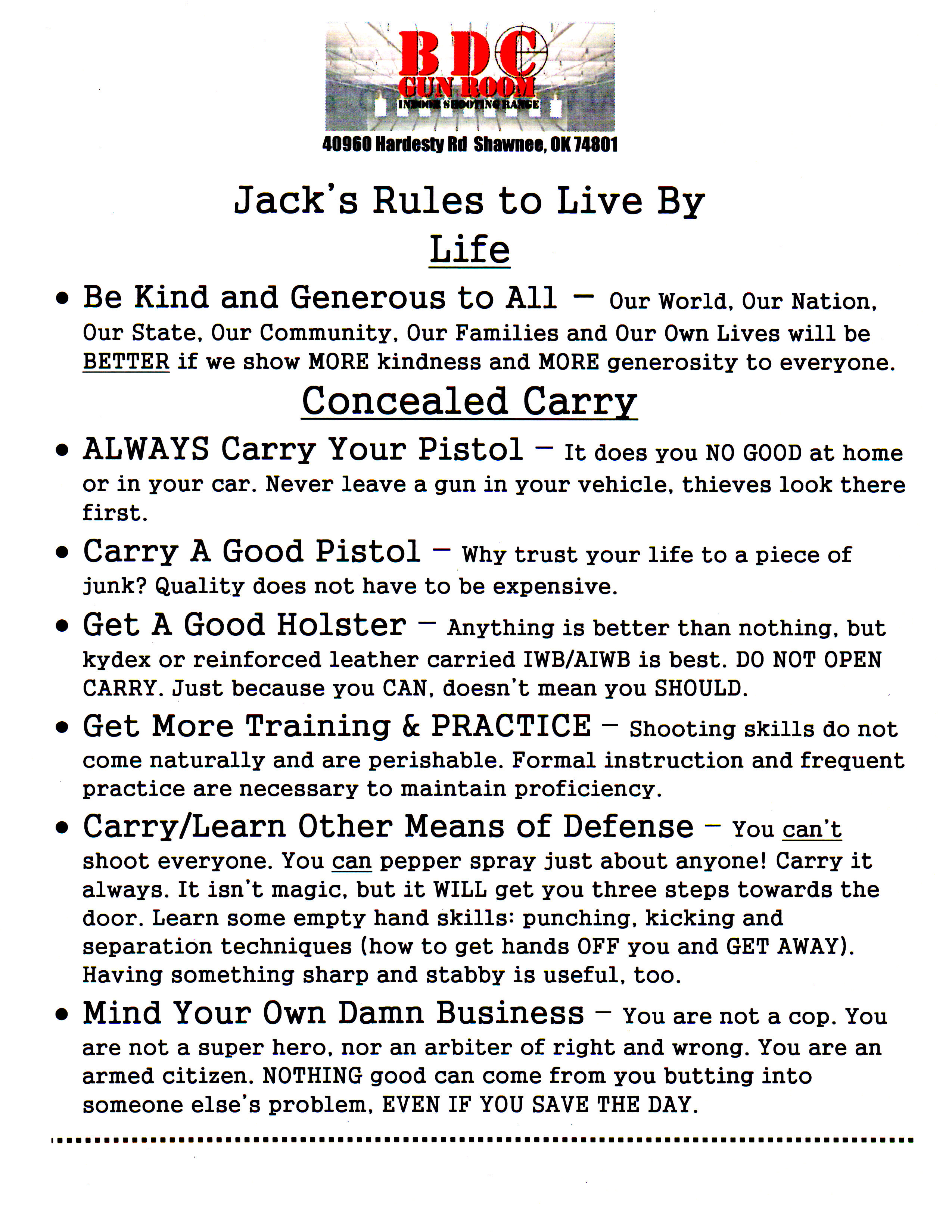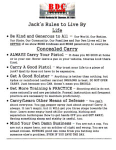 The 2017 Rangemaster Instructor Conference was held at the BDC Gun Room in Shawnee, OK. On the counter at the store, they had a stack of handouts listing “Jack’s Rules To Live By”, written by BDC owner Jack Barrett.