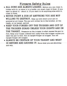 All Guns Are Always Loaded – Before you can clean it, tinker with it, or show it to a buddy, you must clear it first. If you want to shoot it, shoot it. If you want do anything else with it, clear it first.
