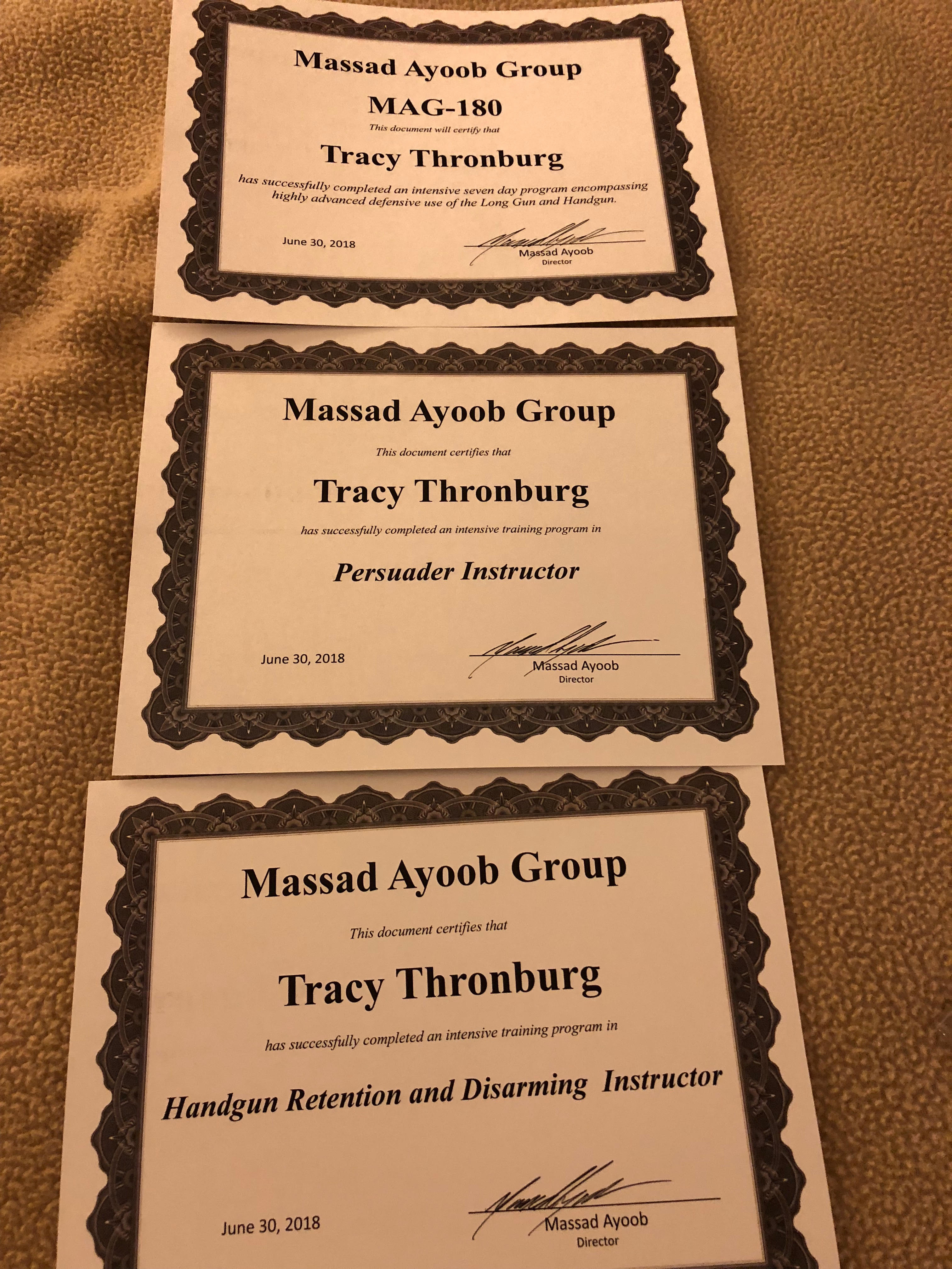 At the MAG-40, you learn the rules of engagement as an armed citizen and how to shoot Mas’s StressFire technique. In the MAG-80, you start learning how to shoot on the move, shoot at further distances and at faster speeds, and are introduced to handgun retention and disarming techniques. In the MAG-120, we learn to train the way Mas and his cadre of instructors train. In the 180, we perfect our instructing techniques for handgun retention/disarm and Persuader (Kubotan®) while shooting challenging handgun and rifle qualifications. Upon successful completion of the MAG-180, you are certified by Massad Ayoob to teach handgun retention/disarm and Persuader (Kubotan®).