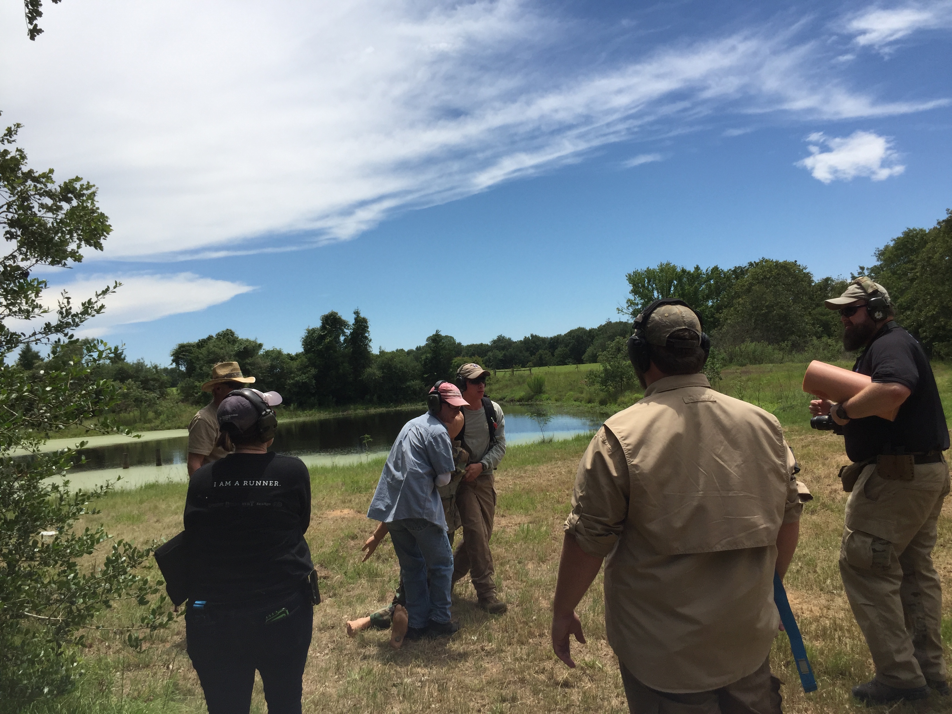 we split the class into teams and ran them through a scenario in the wooded part of the A-Zone property, searching for their missing friend (“Rescue” Randy), who was discovered down by the pond, injured, with multiple threats (falling steel targets) nearby.