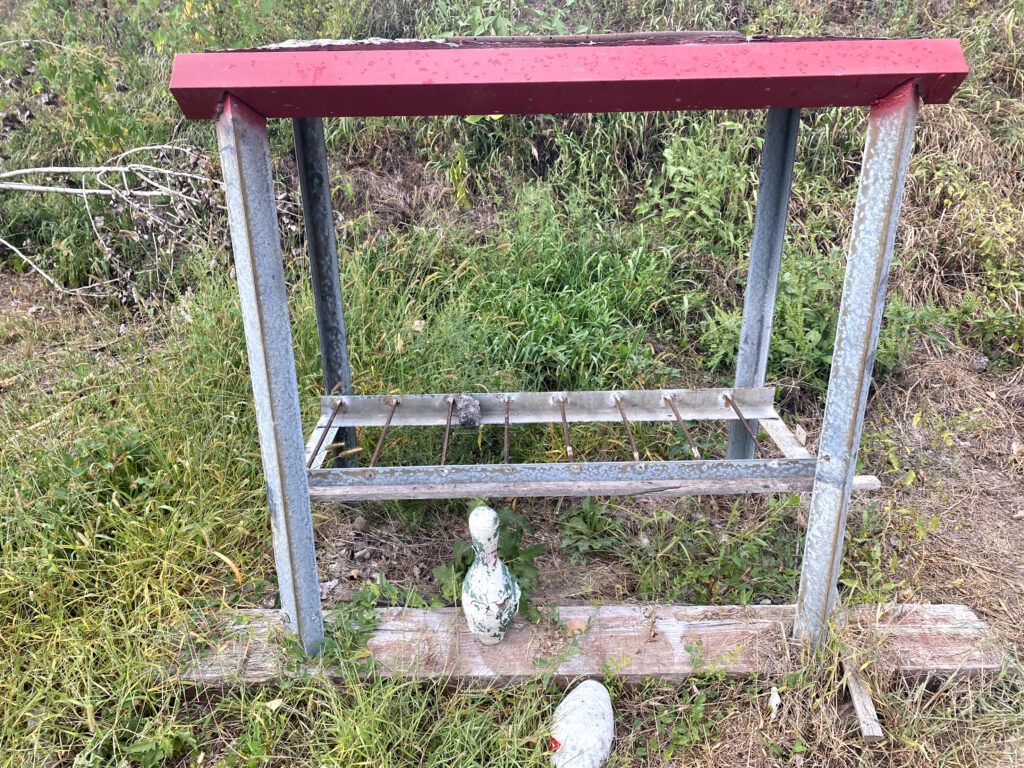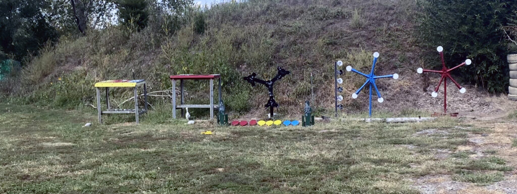 At their range they are set up for all kinds of steel target and pin shooting and cowboy action fun. I took a few pics of their metal pin table to add to my to-do file.