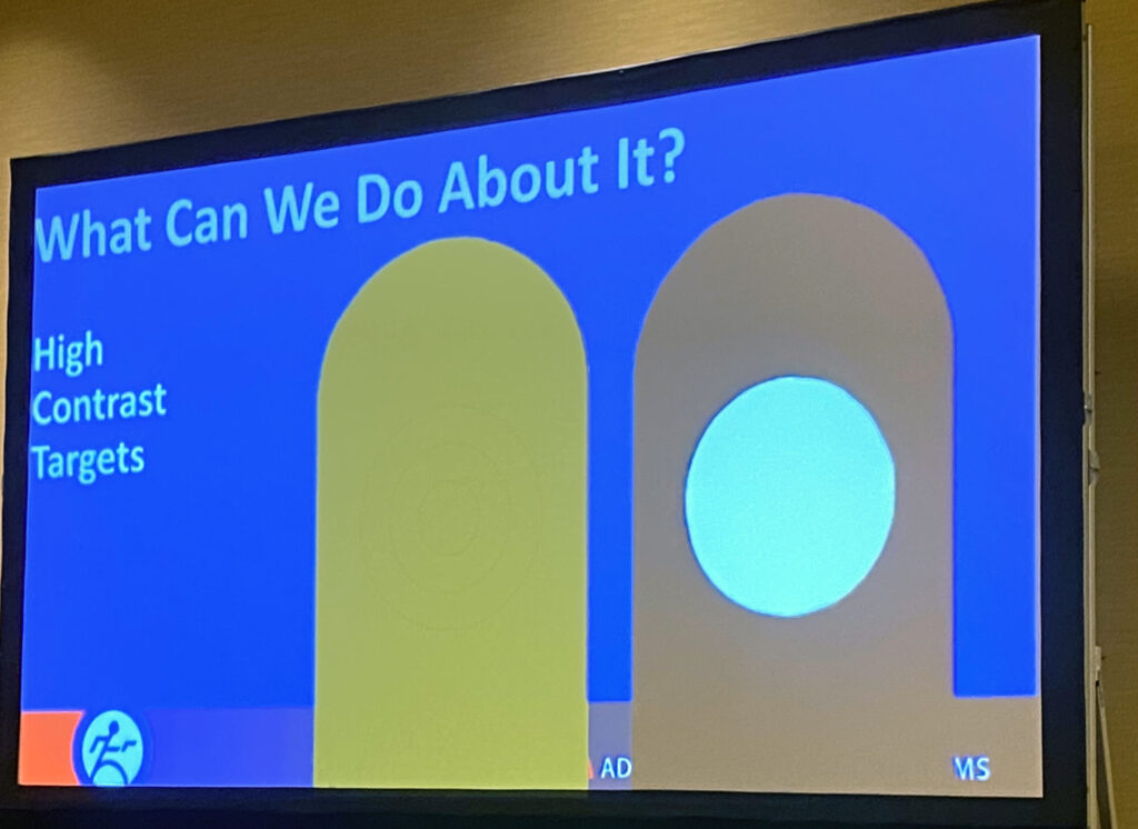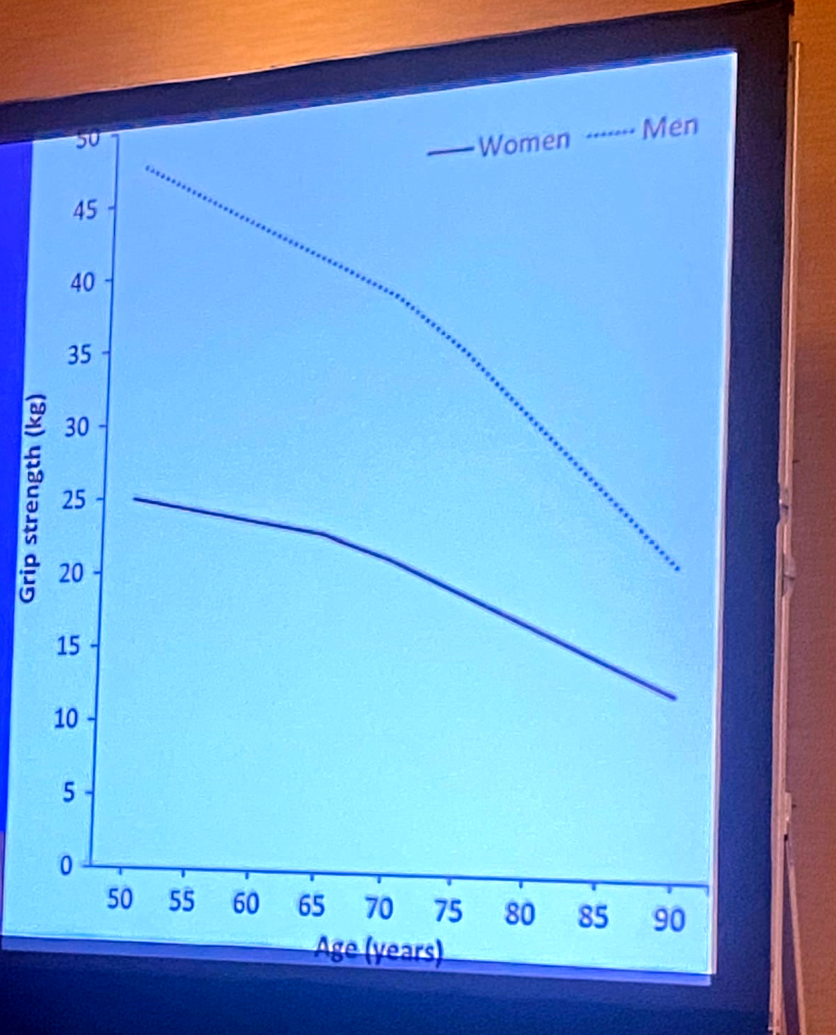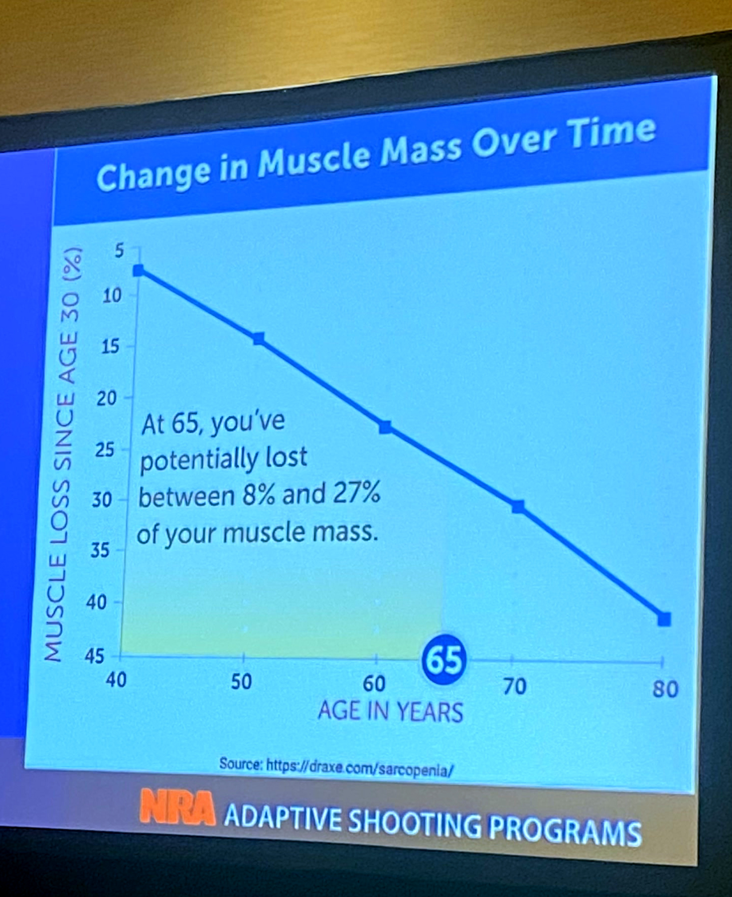 Much of this year’s presentation was instruction on working with shooters with various physical weaknesses. This graph shows average grip strength vs. age. 25 kg = 55 pounds. 45 kg = 100 pounds. Over the past decade, our measurements of student grip strength have shown that 60 or more pounds of grip strength are a significant benefit to shooting a 9mm pistol; 100 or more pounds (which is fairly rare, 80 lbs is more typical for male students) makes a big difference in recoil control. What this graph reminds us is that grip strength will decay with age, with significant losses after age 65-70.