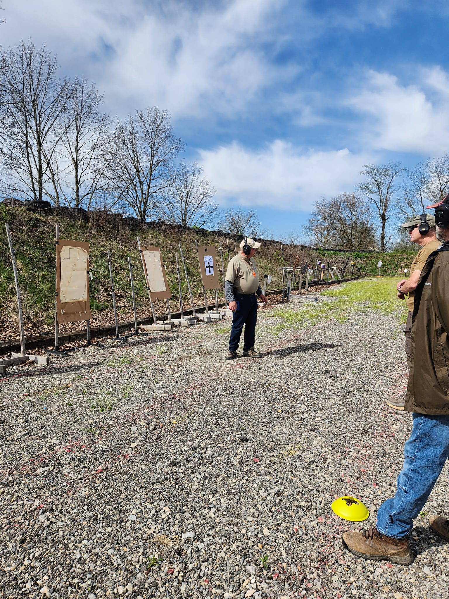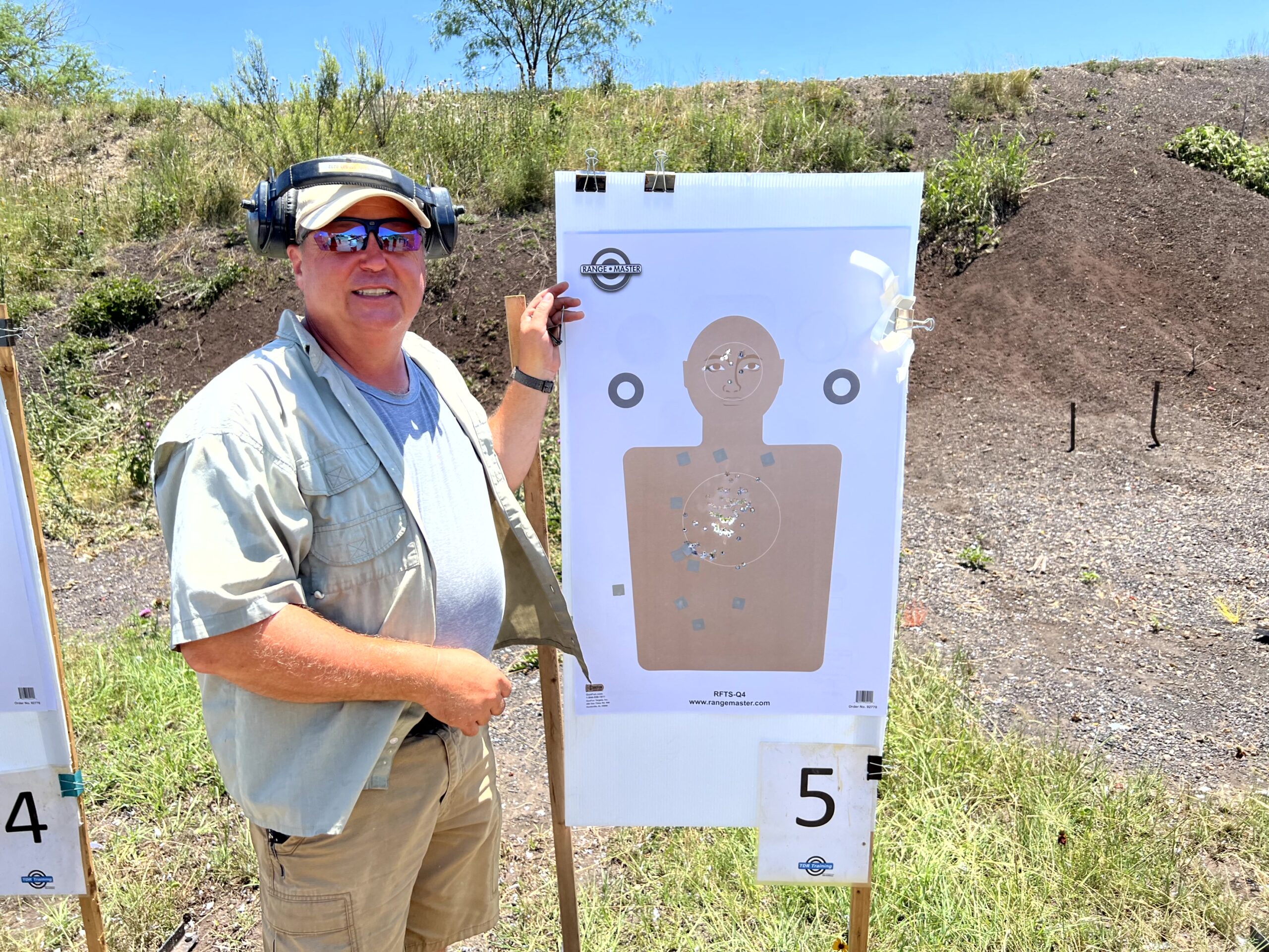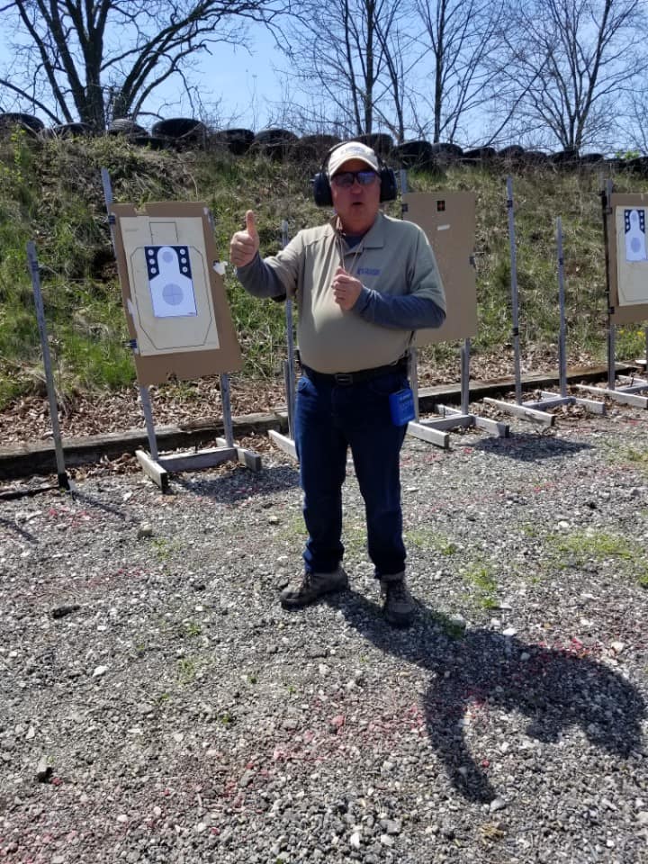 “I recommend using the IDPA Silhouette. Easy to source. Note for scoring purposes only shots in the 3” head circle and 8” chest circle are scored……any shots out of these circles are misses ( -5 points.) 75 points or higher to Pass, below 75 is a fail.