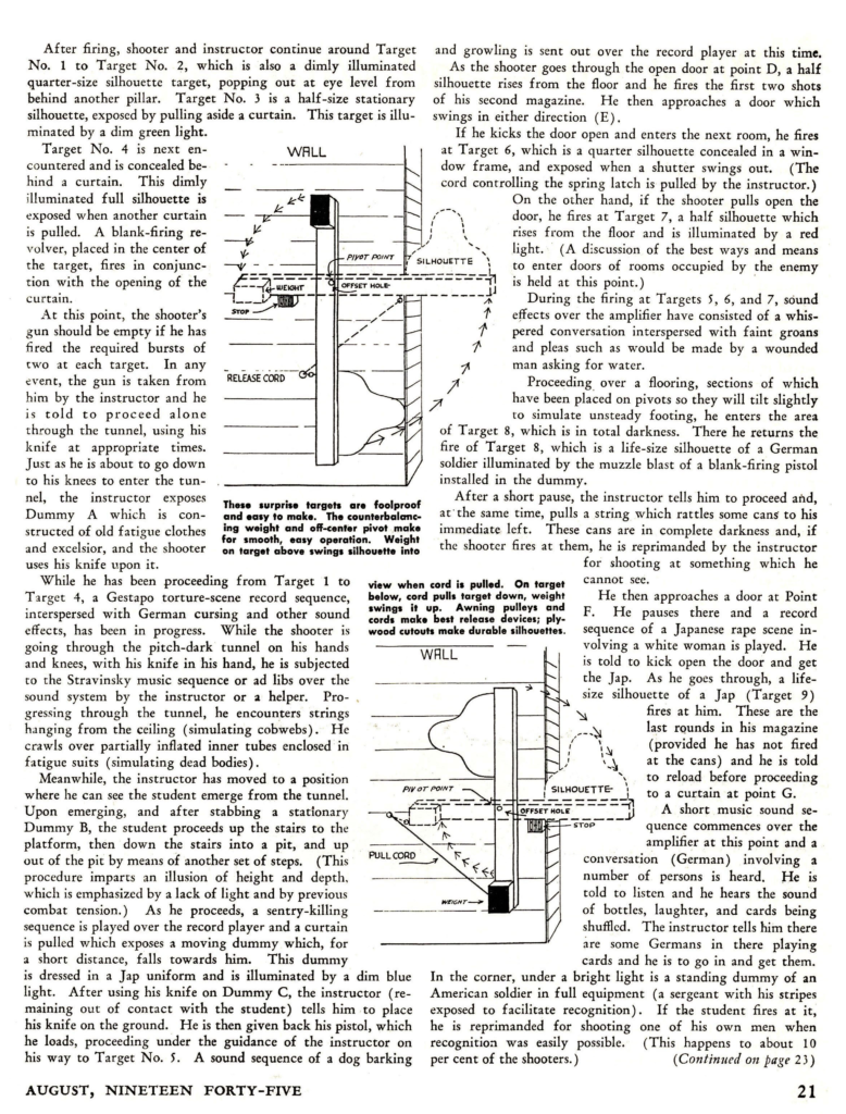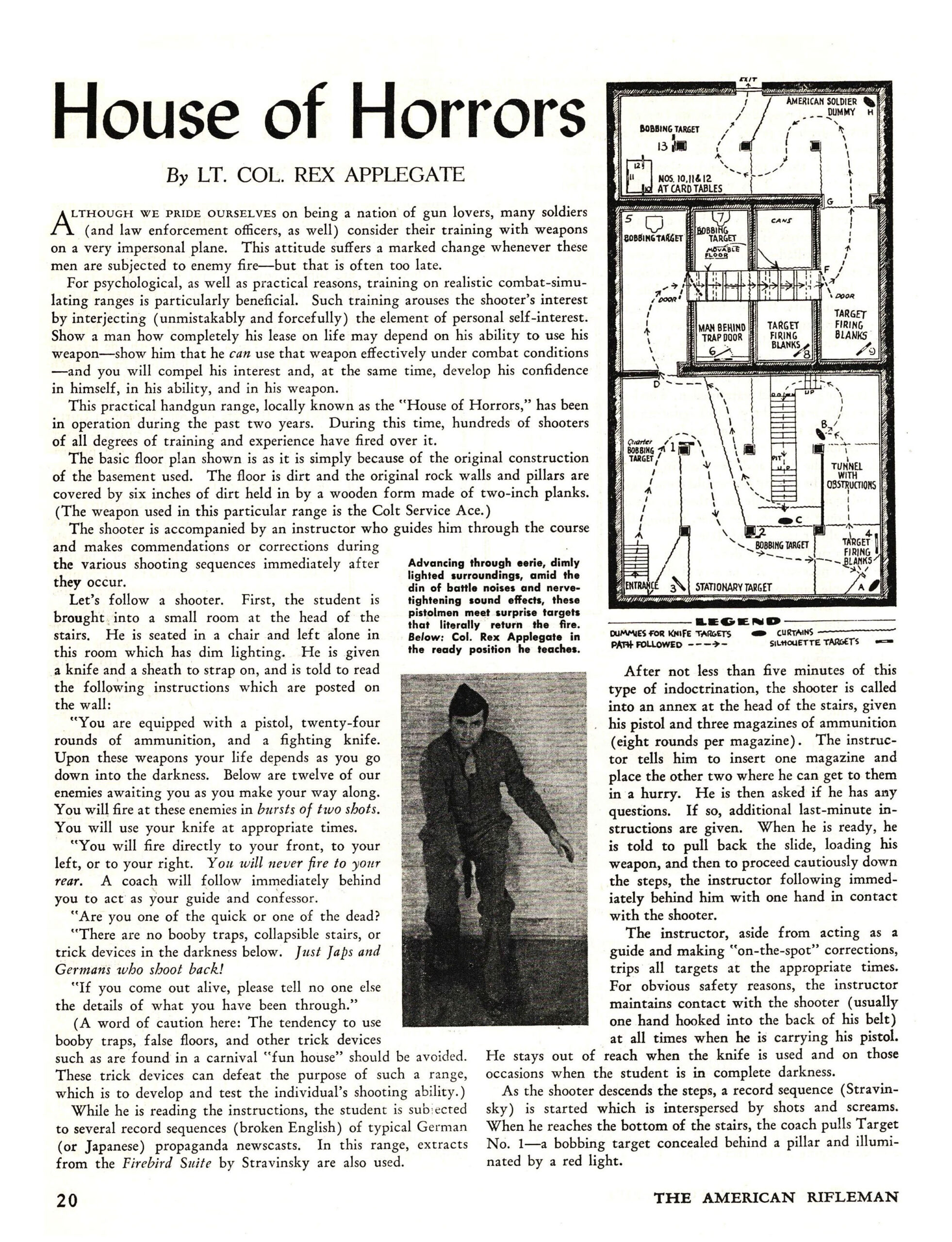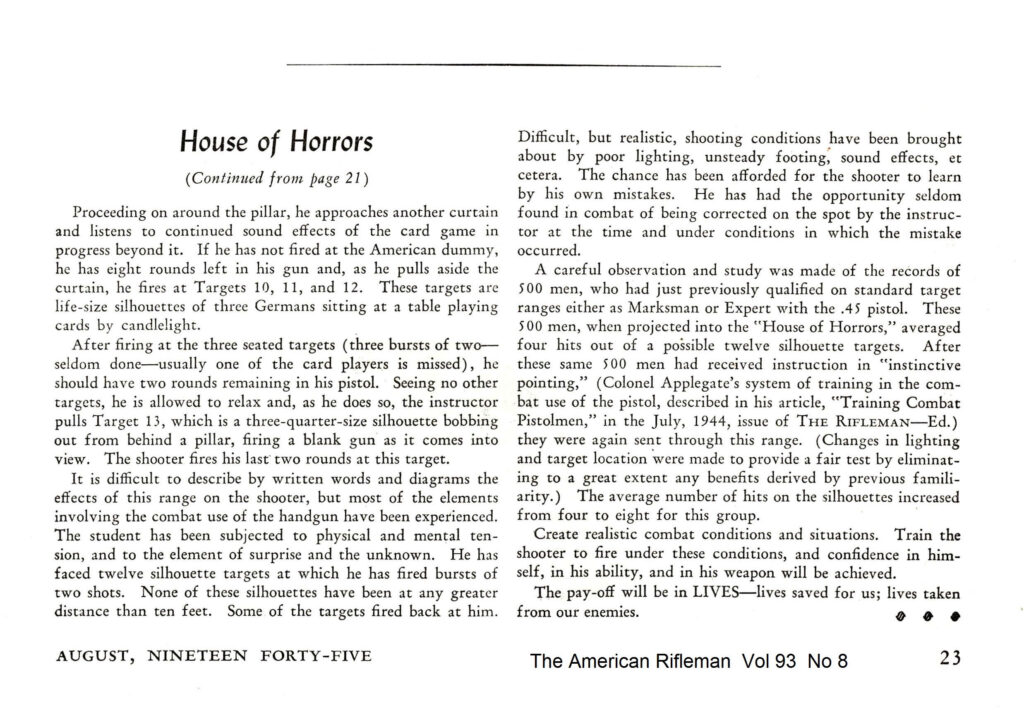 From my historical handgun research team: a 1945 NRA article written by Lt. Col. Rex Applegate describing the floorplan and training conducted in his shoot house. The shoot house included multiple scenarios with 3D targets, props, blank firing guns simulating return fire, audio cues and other elements to provide a realistic simulation.