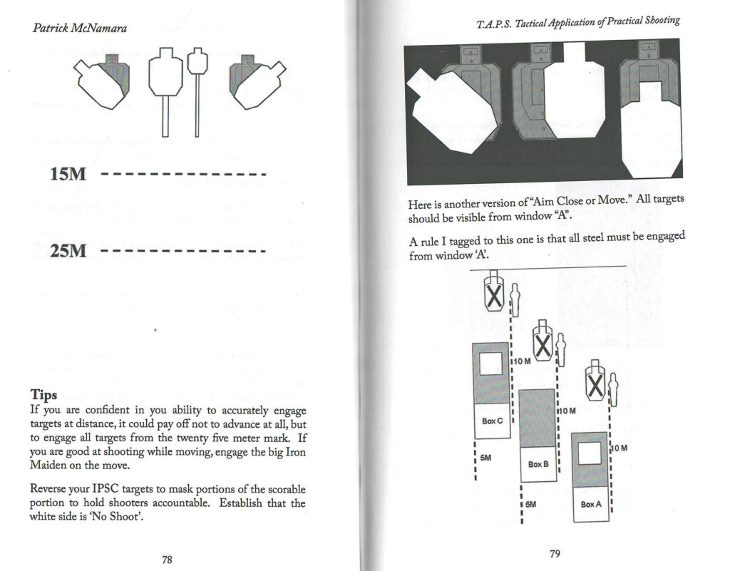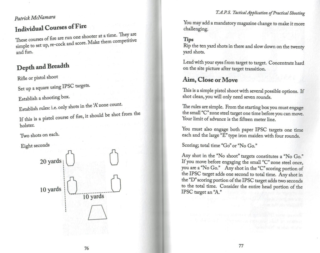 15 yards: draw and fire 2 rounds in 5 seconds. From ready, 3 rounds in 5 seconds