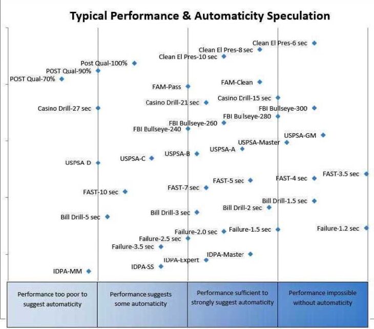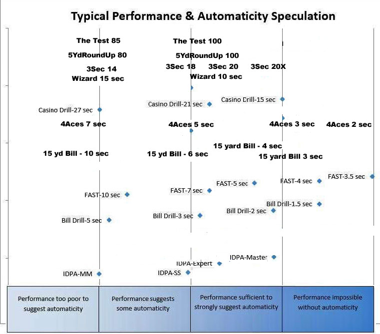 John Hearne developed a chart linking shooter performance on widely used standard drills to assess how automatic a shooter’s handgun skills are. He and I and others have had discussions about the relative difficulty of the drills he used. I didn’t run all the drills that John used in his chart in my class, but I ran several of them and can compare class results with his estimates, and link performance on some other drills not used in his chart.