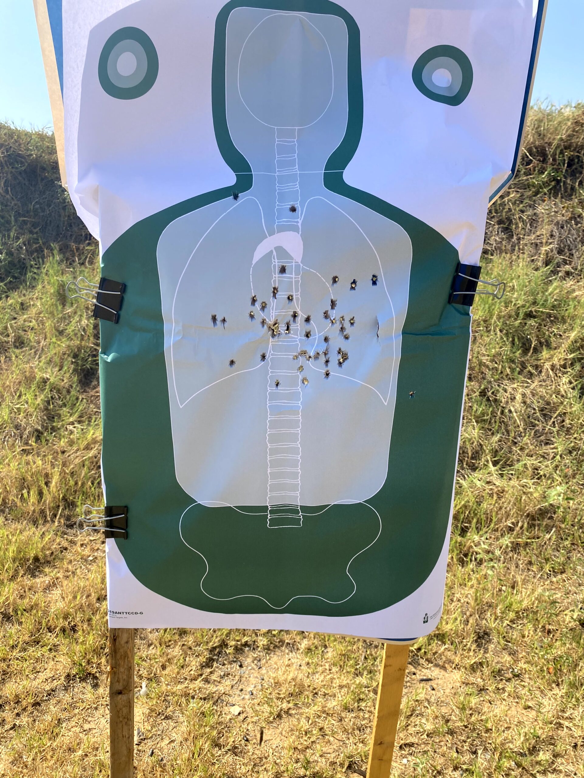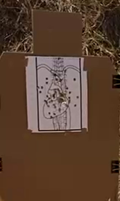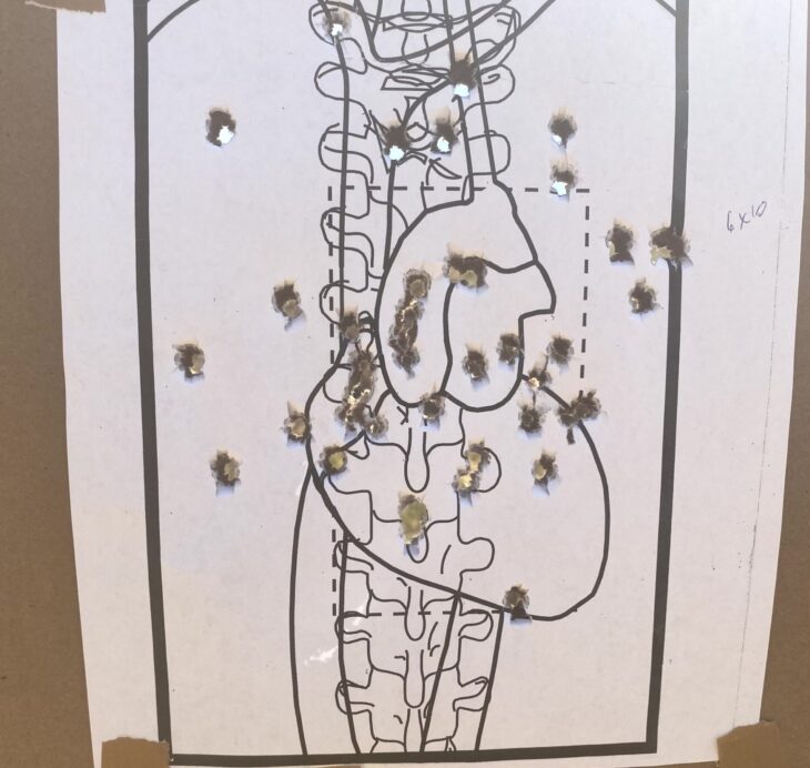 If the entire light colored section was 5 points, then I had only one shot outside it…but a lot of my hits were lower (below the heart), a few strayed up to the top of the shoulder and there’s that one low right flyer. When I went back and looked at that video, I also realized that I didn’t shoot all the strings exactly the way they were described. I topped off the gun between stages and never had a slide lock reload during any string. So my “perfect score” was probably down 7-10 points (or more) and the video wasn’t a fair representation of what the course of fire intended.