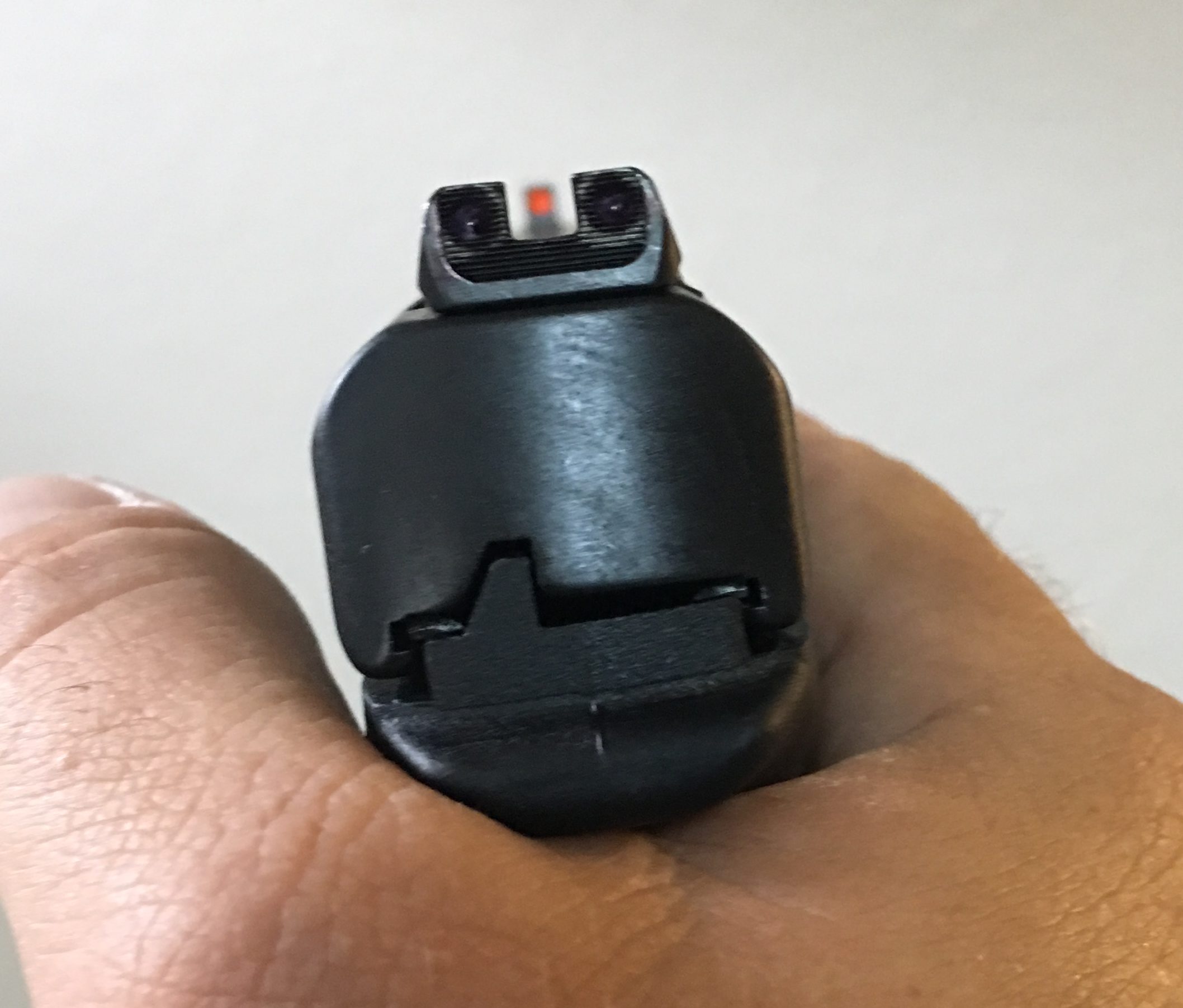 I’m not a fan of 3-dot sights. (Actually can’t think of any trainers or high skill level shooters that like 3 dot sights, but gun makers continue to make the standard option on pistols.) The EZ380 comes with 3-dot sights. I grabbed a Sharpie and a bottle of electric orange fingernail polish (purchased for painting sights), blacked out the rear dots and dropped a dot of orange on the front dot.