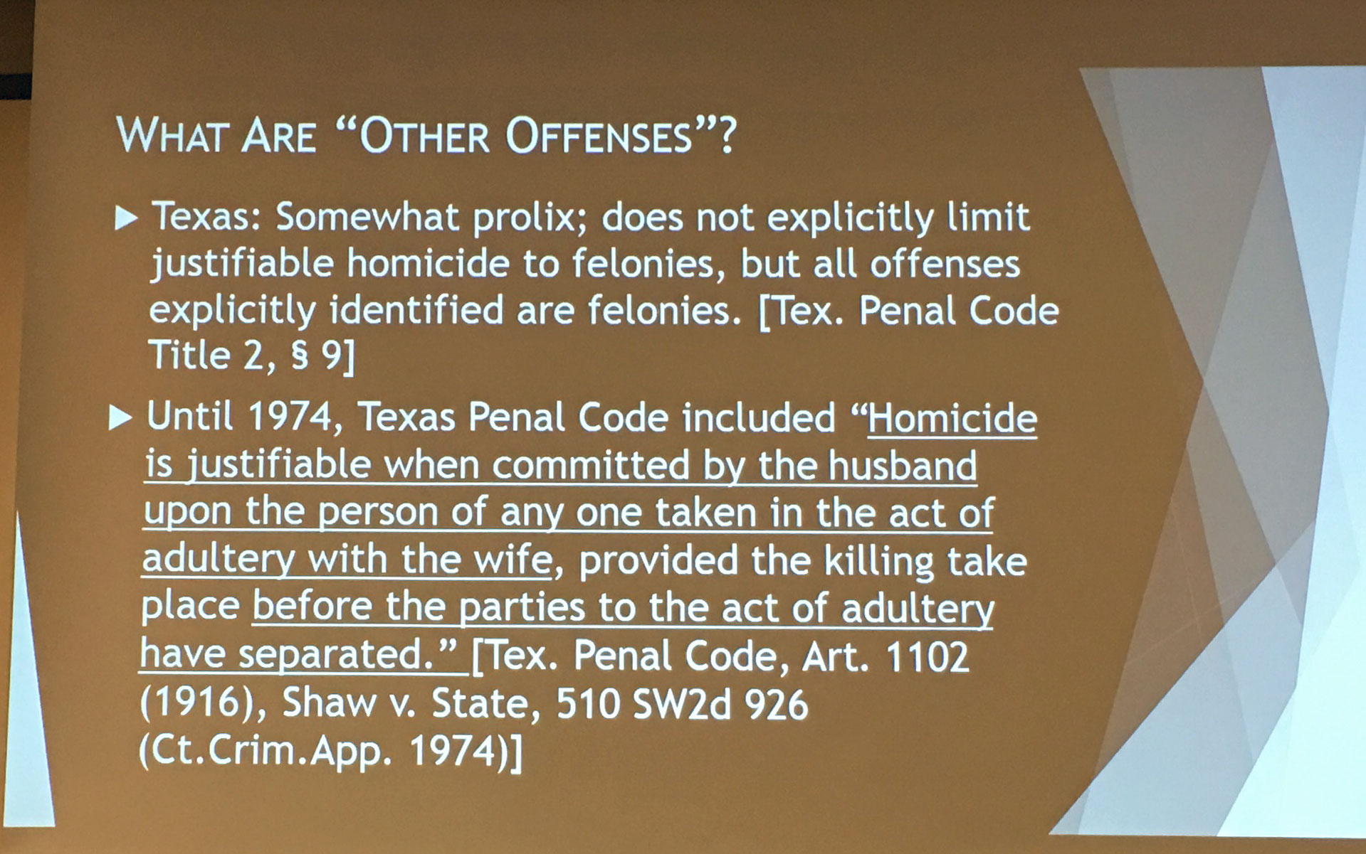 Bonus knowledge: back in 1974, the Texas Penal Code stated that homicide is justifiable before adultery, provided the killing takes place before the parties to the act have “separated”. (This statute had been removed from the deadly force laws by the time the Texas concealed handgun license began in 1995.)