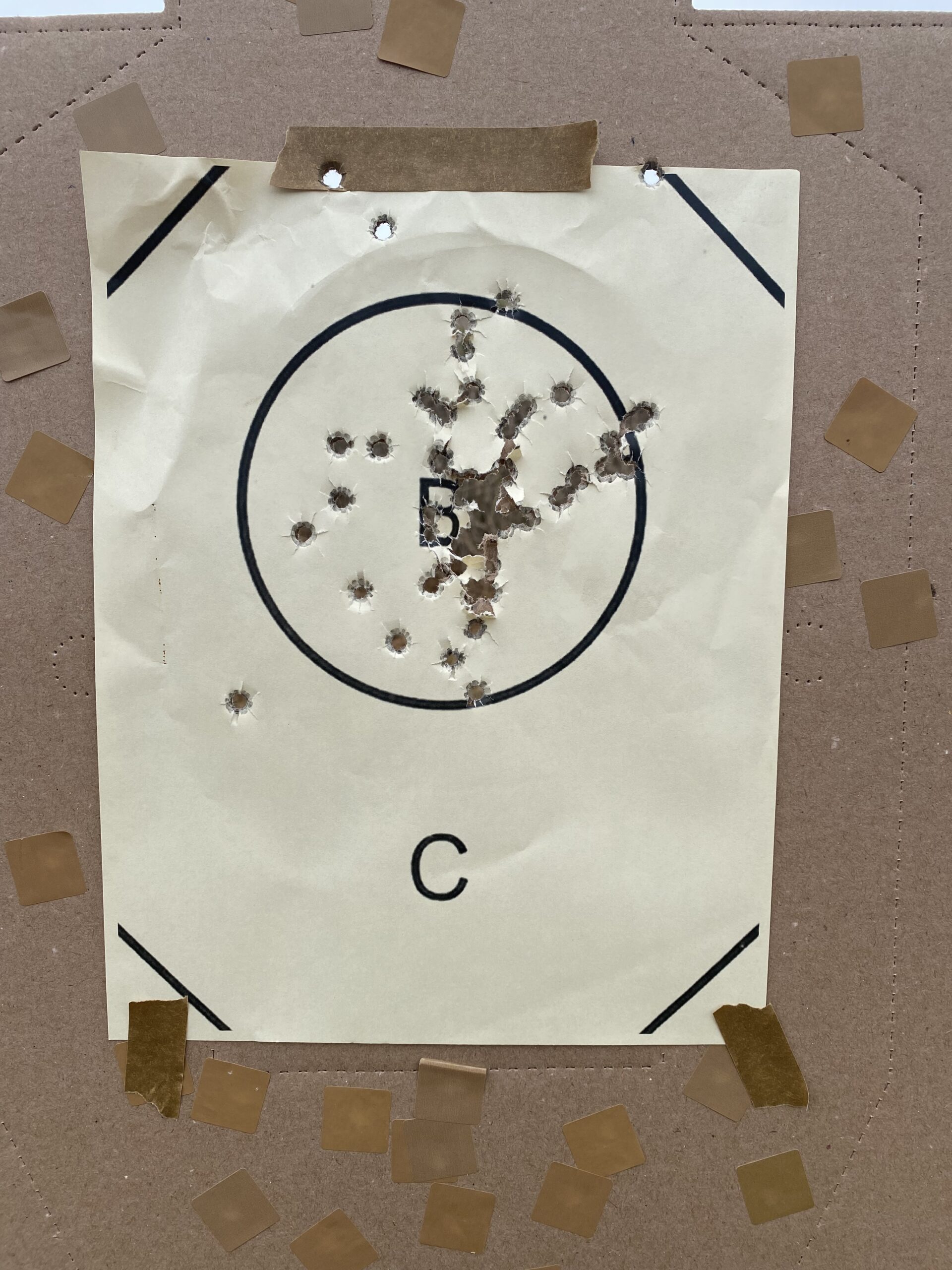 On Monday I shot a personal best 245/250 using the harder/smaller target, shooting the test as my only 50 rounds fired that day. Scoring it using a B27, I’ve shot a perfect score every time, so if you can shoot a perfect score on the B-27 version, try the shootsteel target center with works with their great cardboard training target.