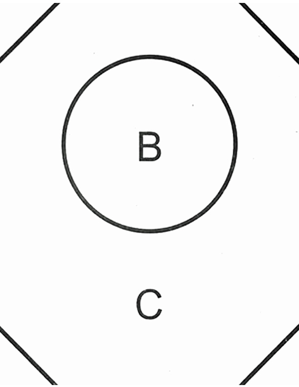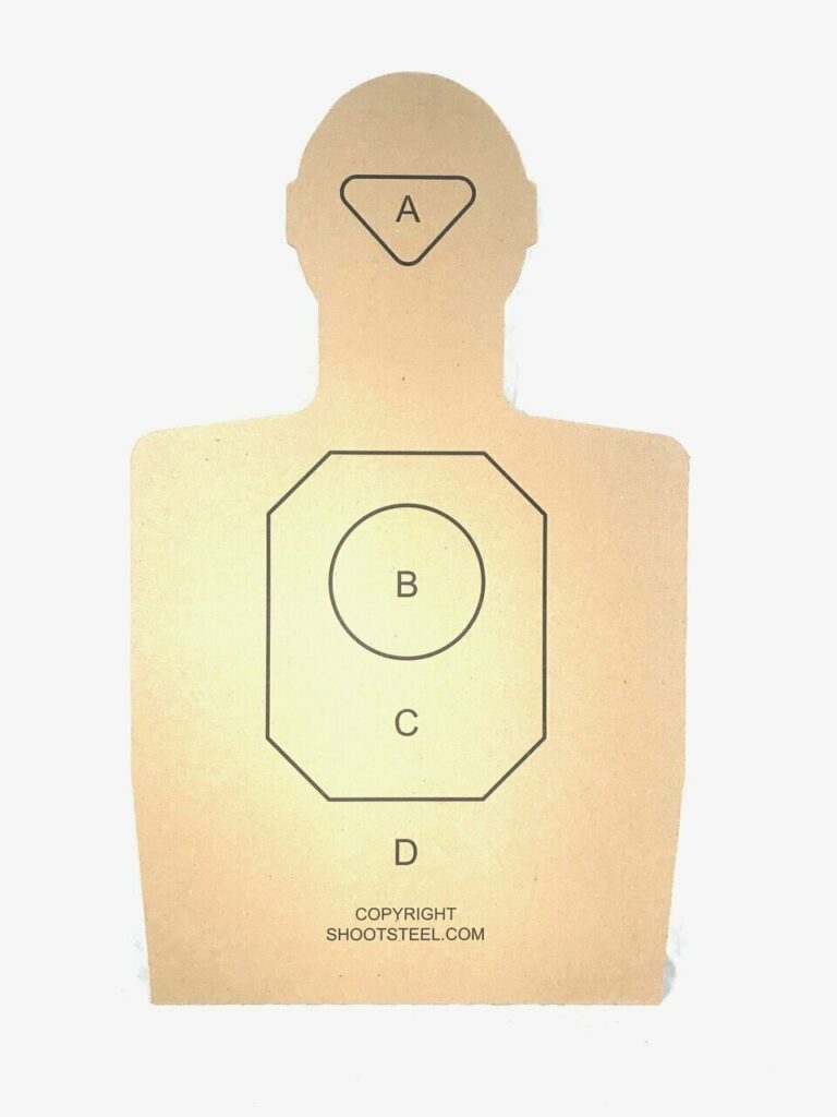 It’s intended to be shot on the giant B-27 target, scored like the Texas License to Carry test (8-9-10 rings score 5, 7 ring scores 4, on target but outside the 7 ring scores 3). To make it harder I’ve been shooting it using a Shoot Steel target center, where the B zone (center circle) scores 5, the C zone (roughly same size as the 8-9-10 ring on a B-27) scores 4, and everything outside the C zone scores zero (unacceptable hit). The images below are NOT to scale, since the B27 is 24″x45″ and the Shoot Steel target is 18″x24″.